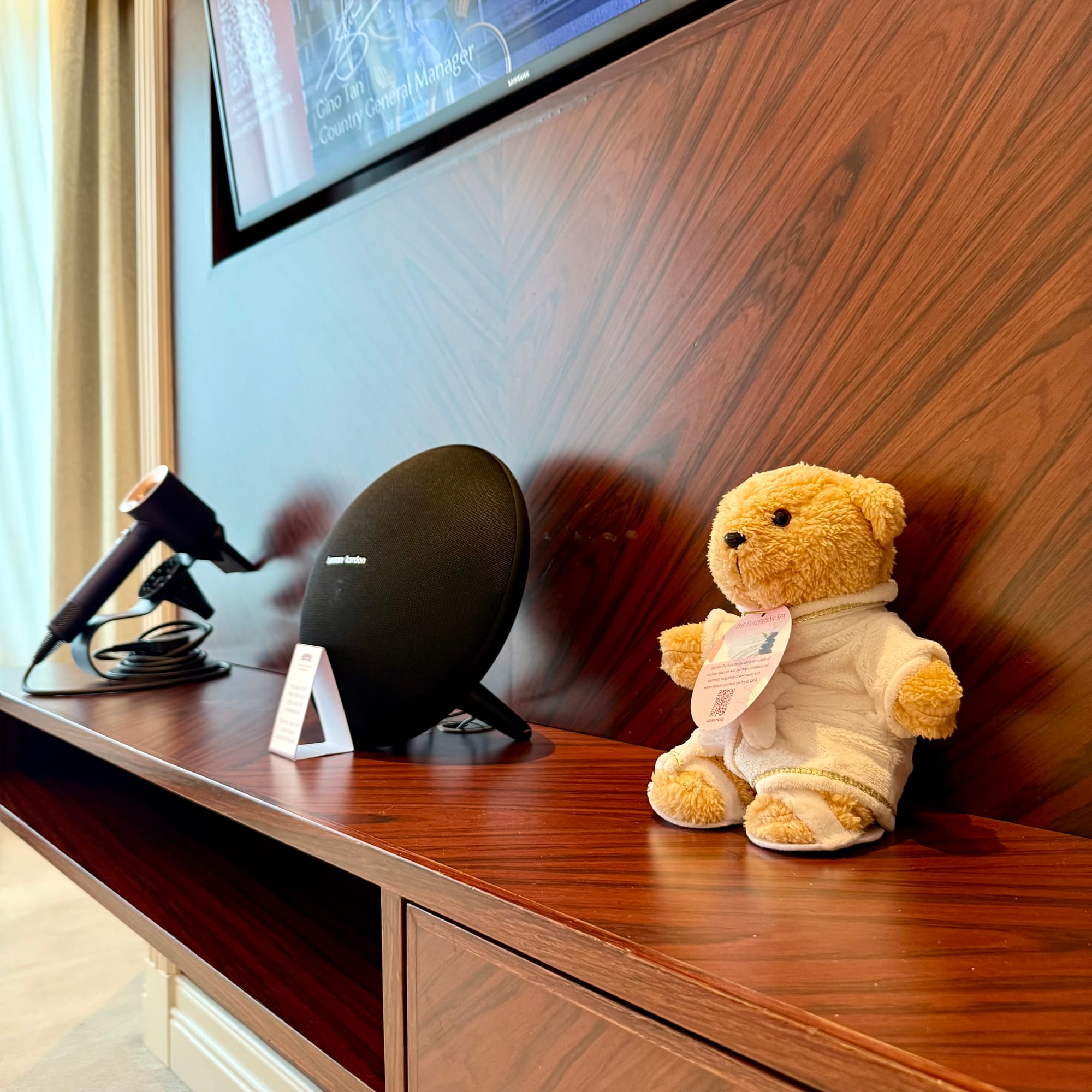 The bedroom adds a second large TV, a Dyson hairdryer and a Harman Kardon Onyx speaker – small touches that pull the hardware out of “standard hotel” territory.