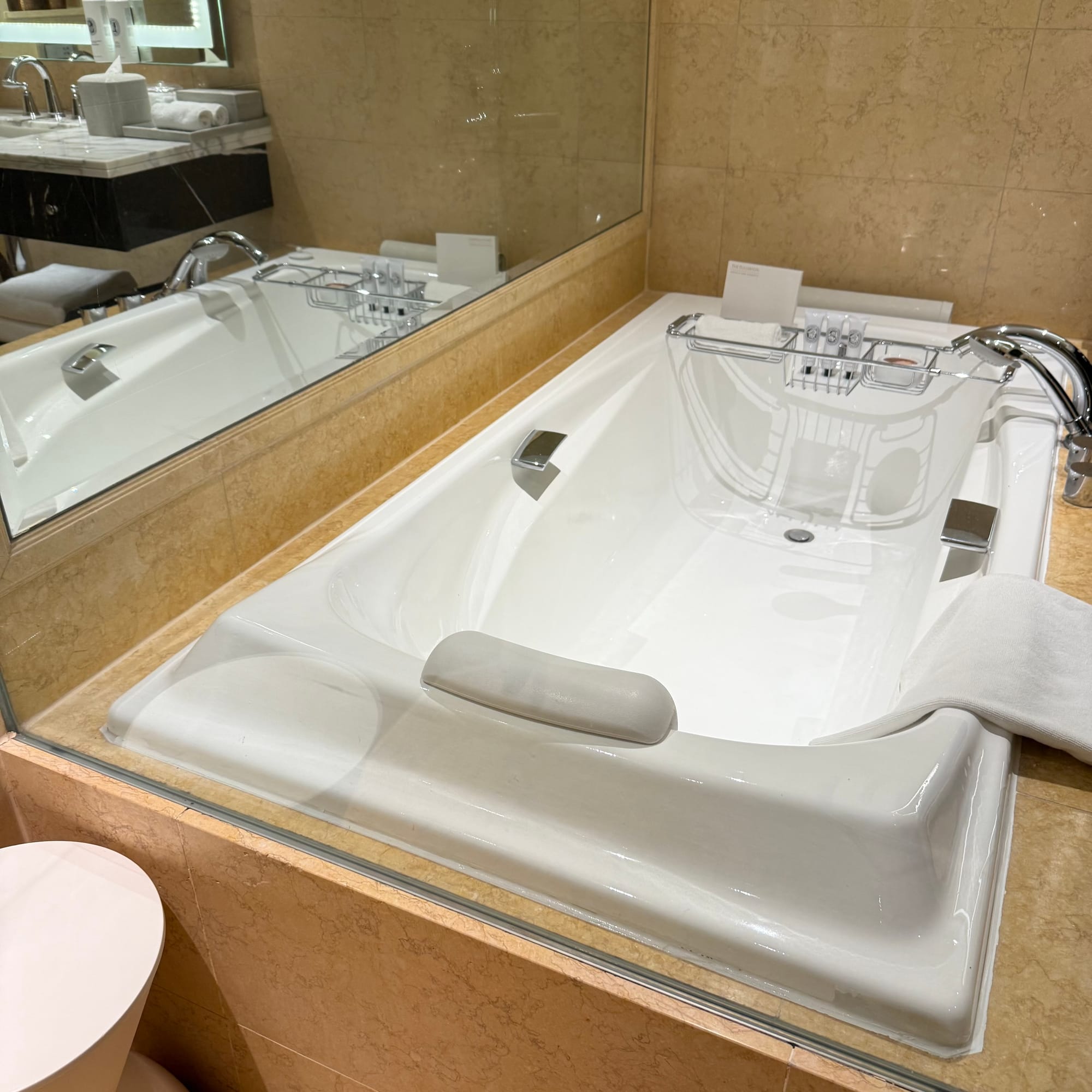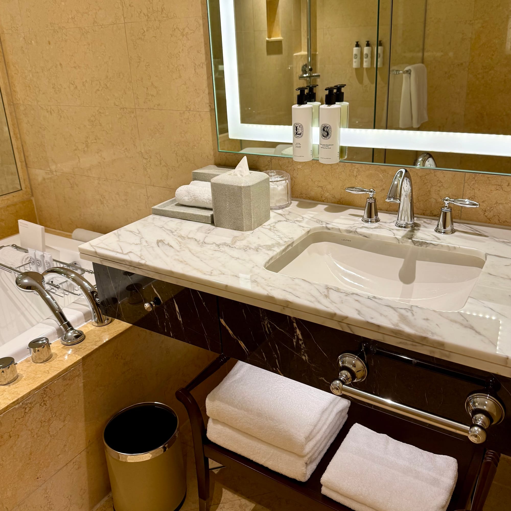 The bathroom, by contrast, keeps to an older luxury language – warm beige marble everywhere and a built-in wall bathtub. It feels slightly dated by 2025 standards, but everything is spotless and many of the fixtures look recently upgraded. Amenities are strong: Diptyque shower gels in both wall-mounted bottles and travel-sized tubes, plus bath salts.