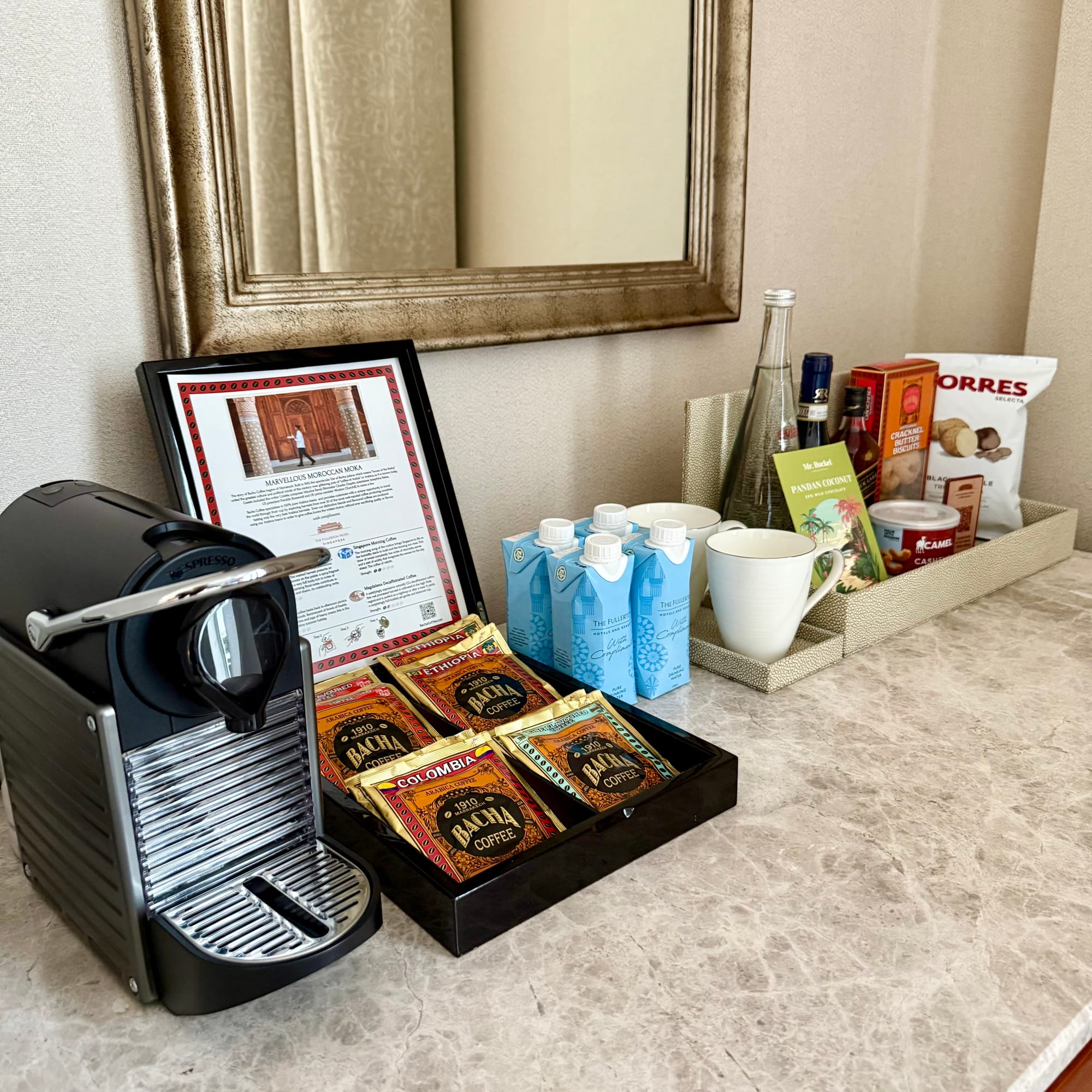 The living room features a massive wall-mounted TV and a proper desk, actually workable if you need to grind through emails. The minibar is nicely stocked with complimentary Bacha drip coffee bags, Nespresso pods, TWG tea and water in recycled packaging.
