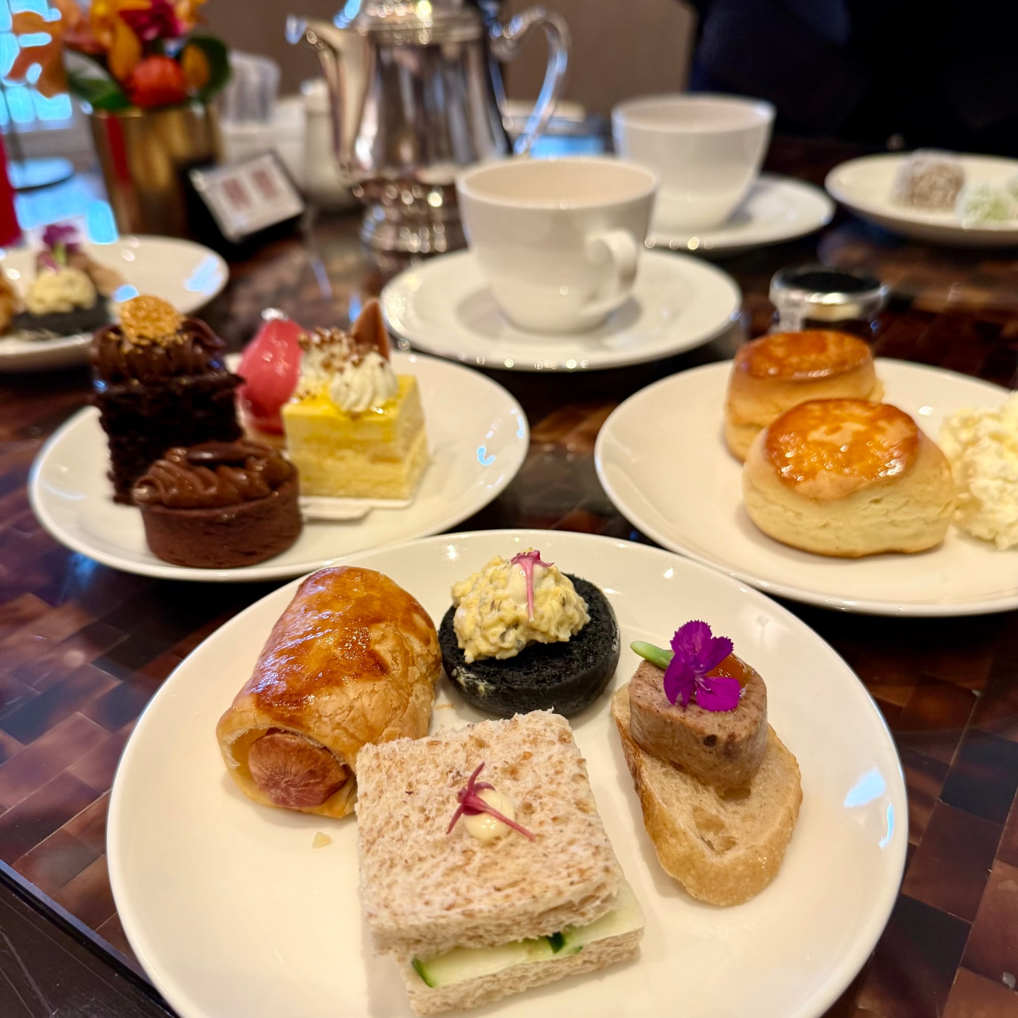 The lounge seats around 50 and was only ~30% occupied during our visit, which kept things calm and unhurried. Tea is served in beautiful silver pots with a broad selection of TWG blends. There’s a small buffet of roughly 15–20 items (about 40% savoury), plus scones and sweets.