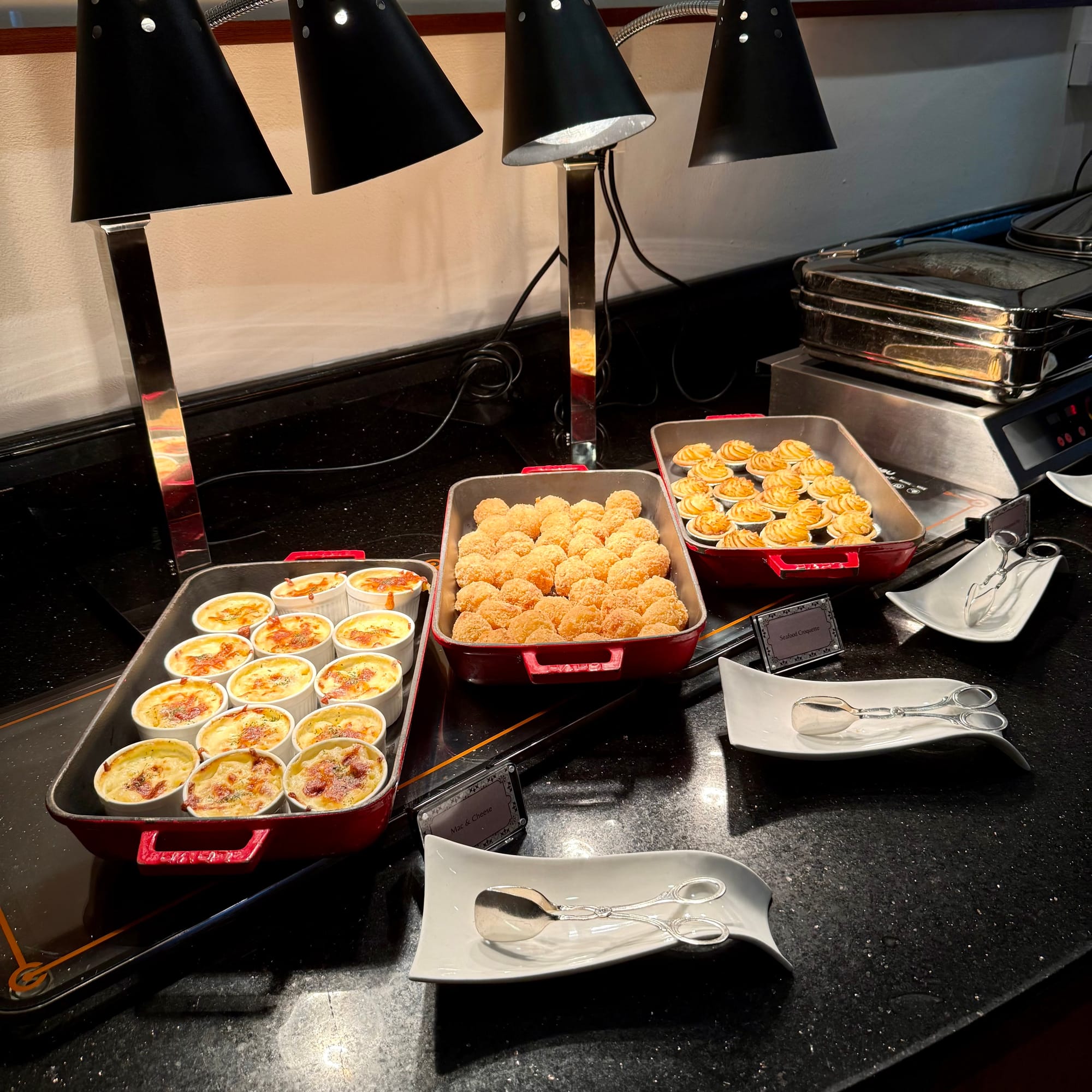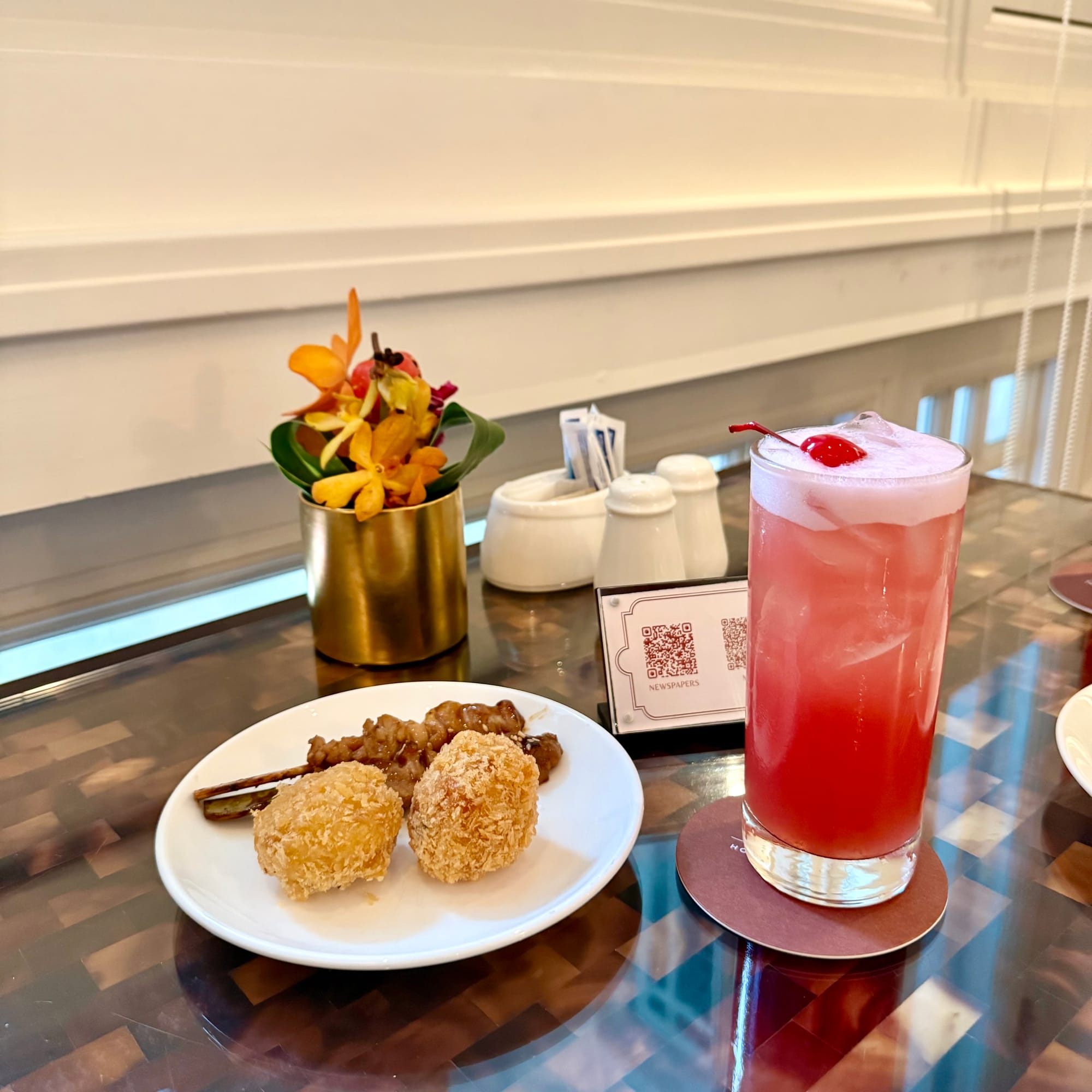 The food spread is varied and, importantly, different from afternoon tea: deconstructed tiramisu, cheeses and charcuterie, a couple of dim sum items, seafood croquettes, shepherd’s pie, yakitori, mac and cheese, plus assorted kueh and cakes. The rotation keeps things from feeling repetitive.
