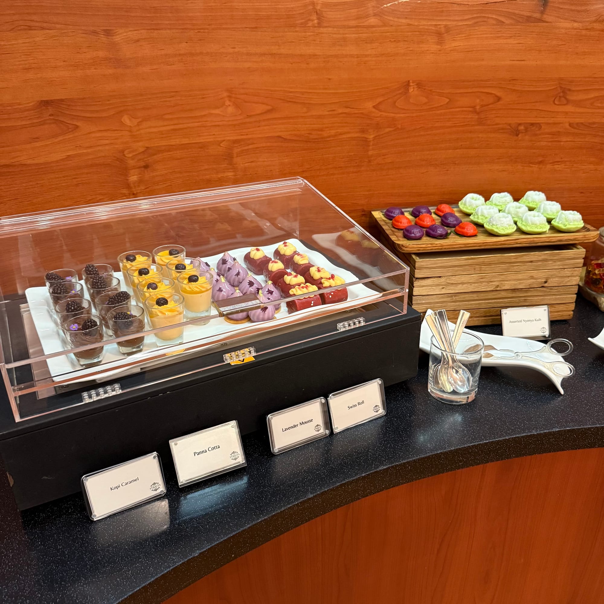 The deconstructed tiramisu is a pleasant surprise – these are often disappointing because ladyfingers need time to soak, but this version is reasonably well balanced. The local kuehs, however, are disappointing: skins are dry and tough, fillings mushy and overly sweet. Given the number of foreign guests in the lounge, it’s frankly a poor reflection of Singaporean kueh – this is not what local sweets are about.