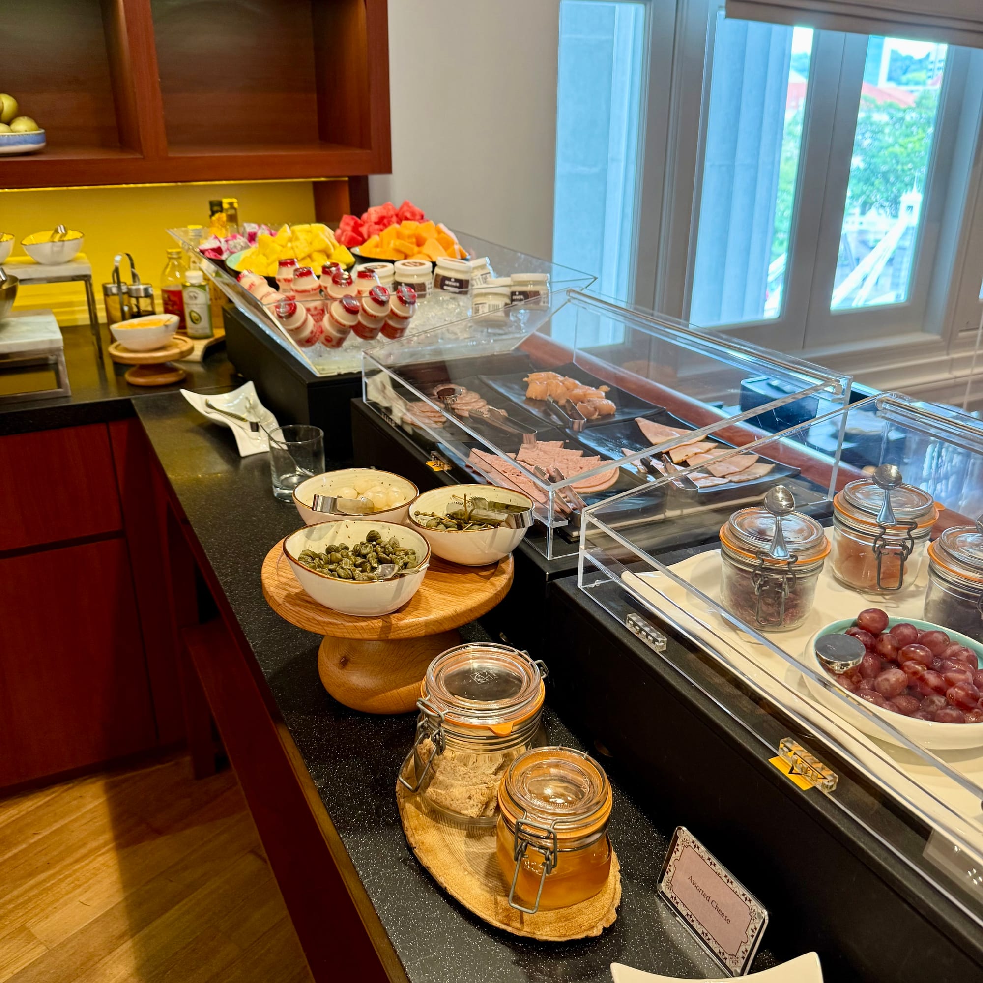 A small buffet supplements the hot items, with fruits, cheeses, pastries, dim sum, congee and English breakfast staples (two to three options per category). Quality varies significantly; many pastries were very average, so it’s a case of picking the best-looking pieces.